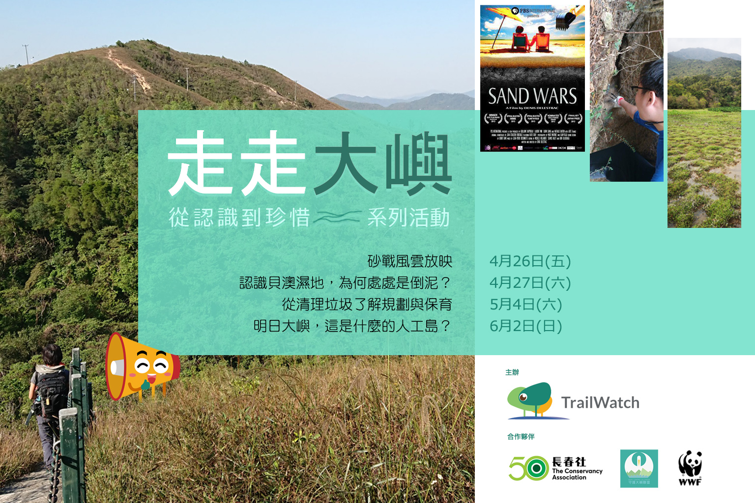 什麼是明日大嶼?什麼是‎人工島?邊住邊填海?你有真正了解過多項以發展名義,背後承受著破壞環境永遠不可逆轉的代價嗎?大嶼山有山有水, 山巒, 海洋, 河流, 叢林, 濕地, 形成豐富嘅生物多樣性,具相當生態同科研價值。TrailWatch會在四至六月聯同世界自然基金會香港分會、守護大嶼聯盟及長春社,一齊走走大嶼,重塑我們與大嶼的關係。