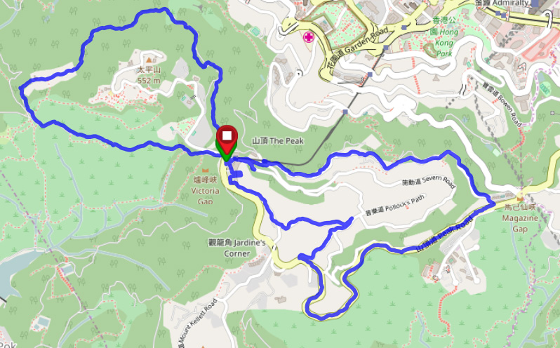 路綫:山頂廣場 > 盧吉道 > 夏力道 > 山頂廣場 > 白加道 > 山頂道 > 忌利文道/歌賦山道 > 種植道 > 山頂廣場