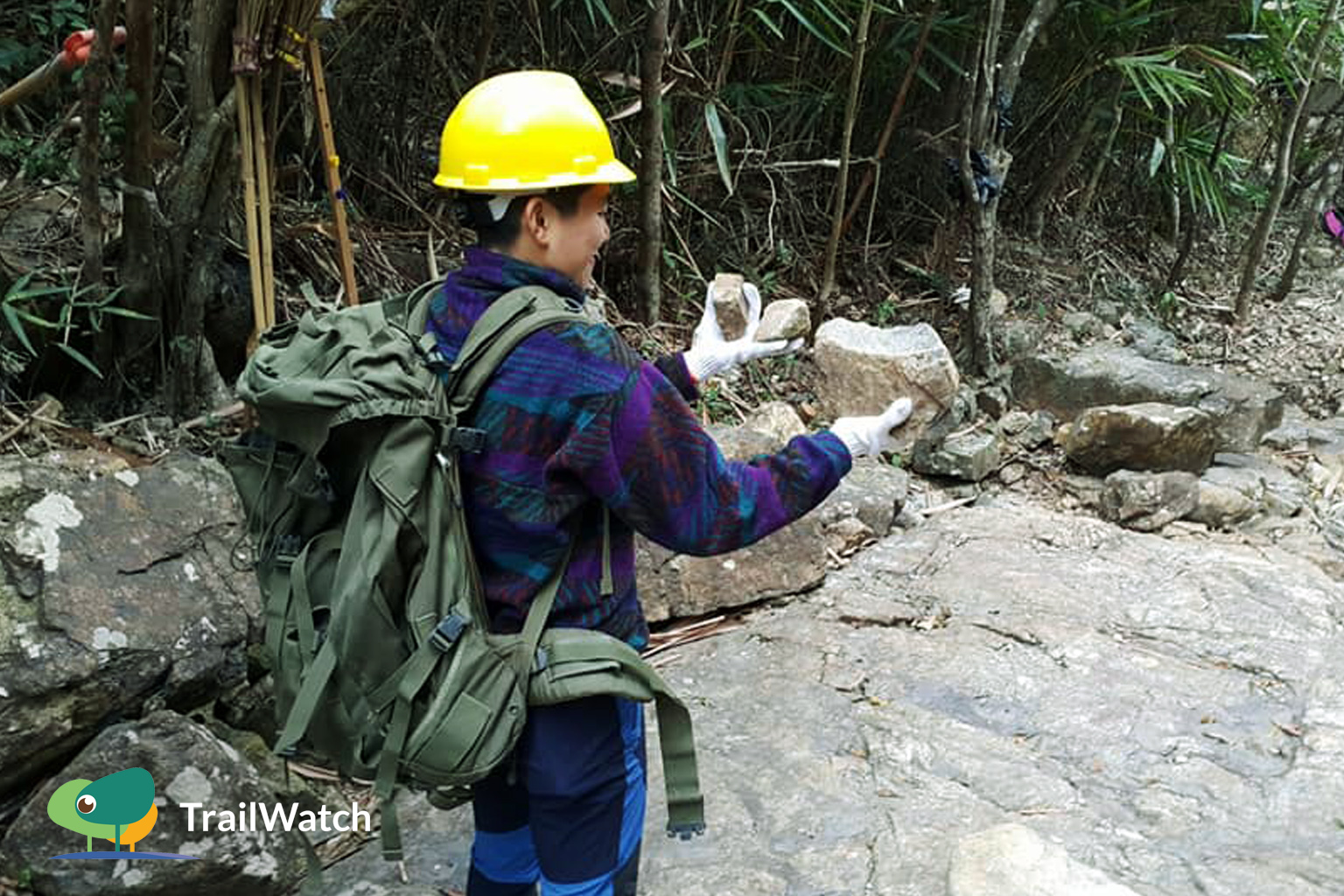 與師傅到附近河道撿石頭來維補山徑