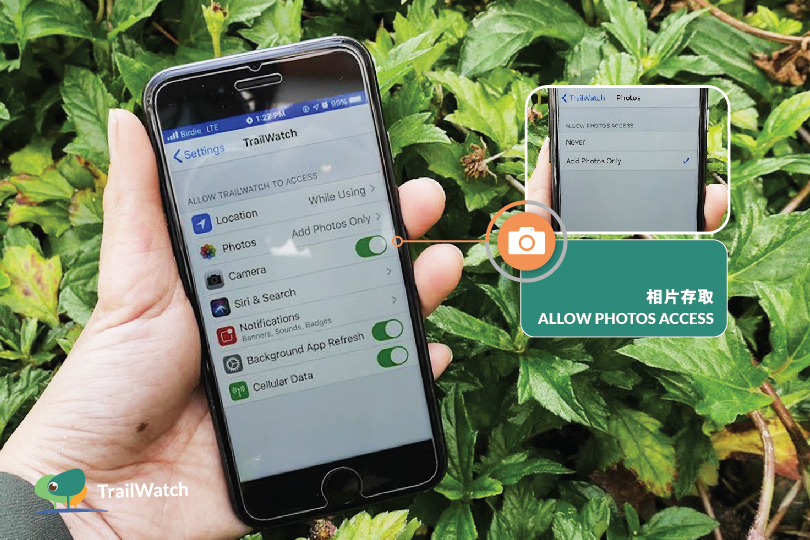 Besides marking landscape and wildlife photos along the trail, the App also backs up and saves your photos. In order to save and view the taken in the App, iPhones users need to enable "Allow photos access" in the settings before the photos will appear in "Photos". As for Android users, your photos will be placed in / dcim / camera. Remember not to move or delete photos until the route is uploaded, otherwise your route photo record will be incomplete.