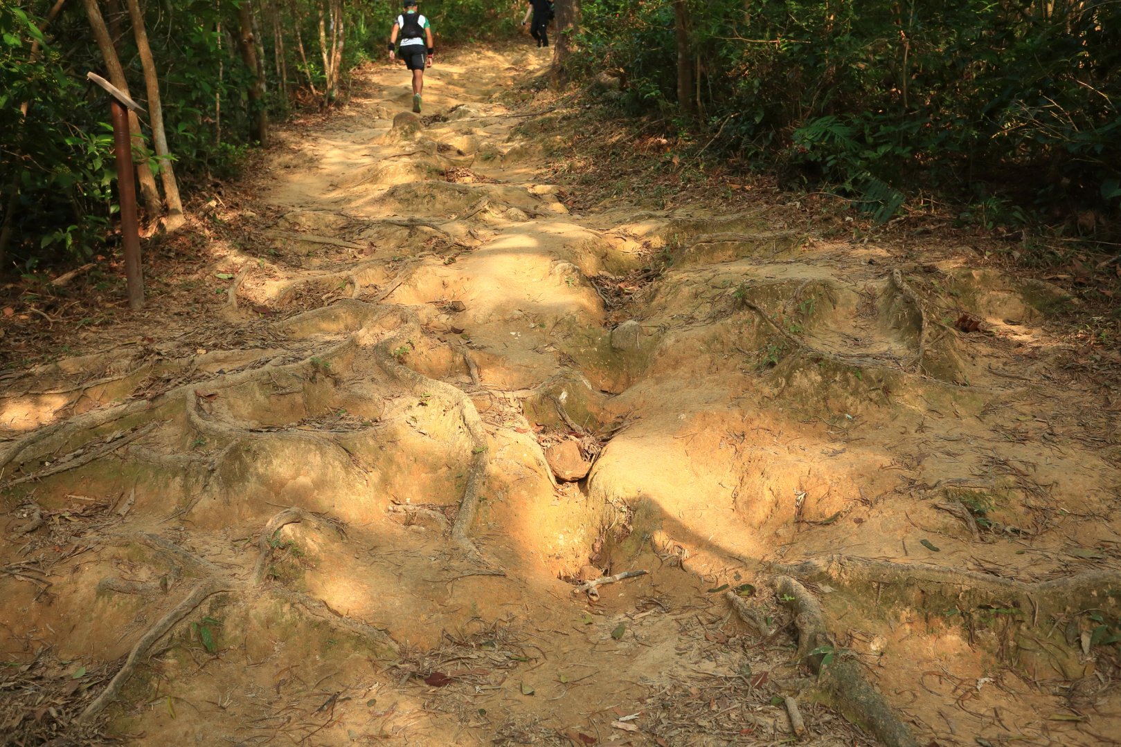 The word “bumpy” is often associated with hiking trails; however, the bumpiness of the trail is not only about going up and down the mountain, but is the result of soil erosion. Deep trenching, where the tread wears down creating a trench or a rill, is the most typical example. This condition is worsened by the high-use of the trail, especially of steep trails. The exposed tree roots and stabilisation facilities or the sunk roadbeds show different levels of damage. The “bumpy” road could be a sign of the soil erosion.