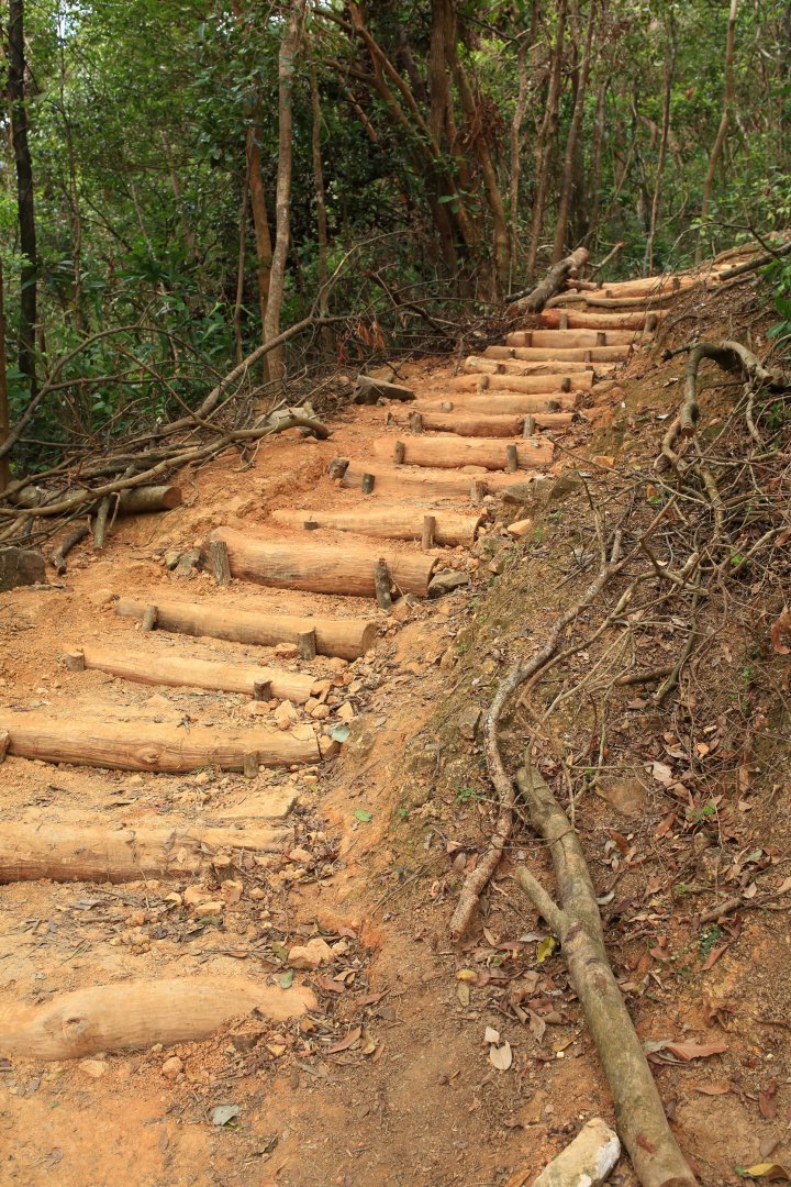 Would you choose the soil path that is next to the concrete path to prevent knee pain? Have you ever slipped on the smoothly paved trails after it has rained? Without a doubt, hiking trails would gradually degrade due to increased usage or other environmental reasons; however, the management authority always uses unsuitable materials such as concrete that is low in permeability, or granite blocks to standardise and “conserve” all types of trails. They rarely consider the geography or pay attention to the water source for appropriate dredging. In the long term, this kind of management would speed up soil erosion and lead to a vicious cycle which would worsen the hiking experience or encourage visitors to exploit new paths. Although natural materials such as wooden logs and large rocks have recently been used to pave trails, there is no single maintenance method for all cases. Research is required for different locations to avoid deficiencies in design, unnecessary touch ups or inappropriate maintenance that could in fact harm the natural environment.
