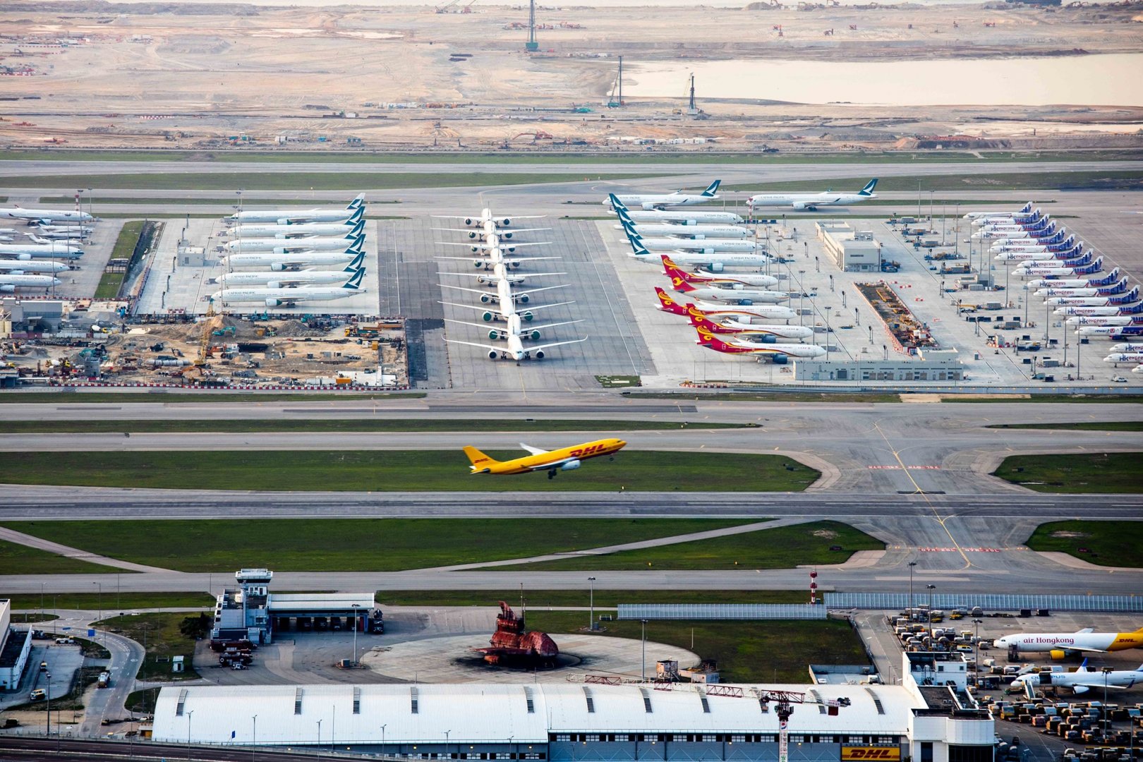 Due to the pandemic, the frequency of air traffic has dropped significantly. Plenty of planes are grounded and parked at the Hong Kong International Airport. In contrast to the normal busy days, the airport is now quiet and peaceful. It looks just like a brand new toy model airport from the Ngong Ping 360 Rescue Trail.
