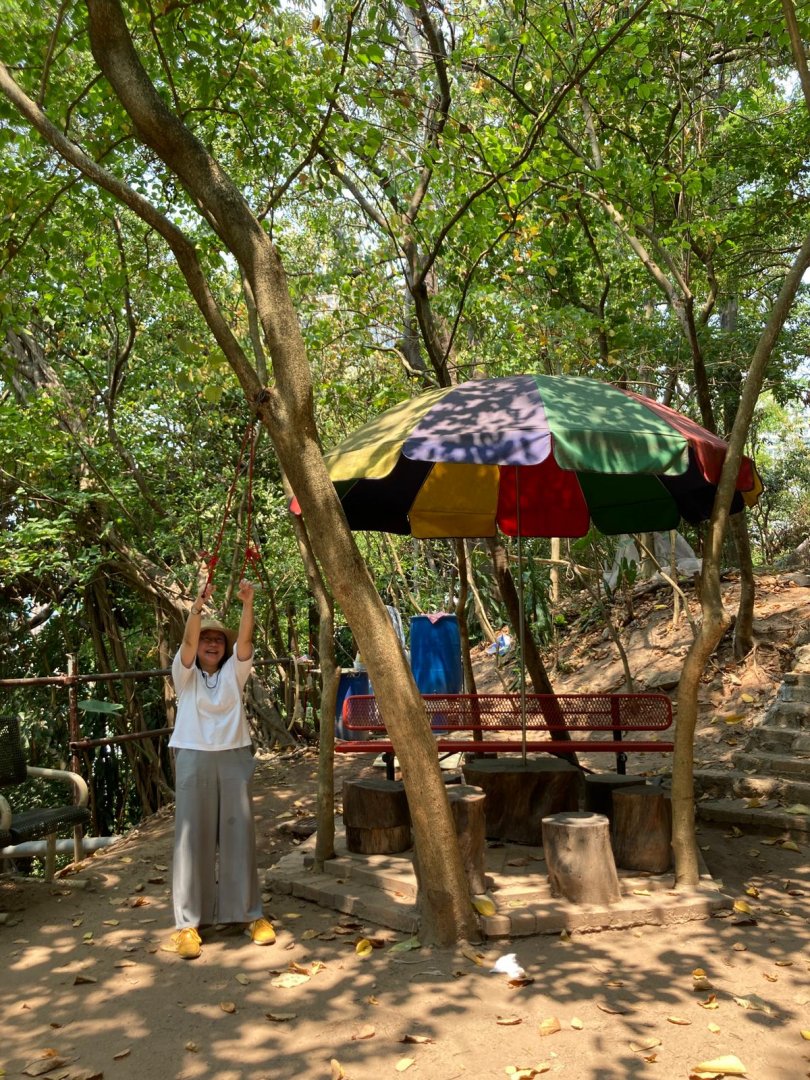 This one-person endeavour quickly turned into a collective effort. Cluster after cluster of leisure corners were built one after another. Even today, kids play table-tennis while parents enjoy other aspects of being outdoors. There are tables for chess, mahjong and a dozen gardens where people grow different flowers and plants. Construction is ongoing. Trees struck down by various typhoons since 2008have been turned into tables and chairs. Abandoned metals from construction sites have become sitting benches. There are beach umbrellas to provide shading from sunshine and clocks for hikers to check their time. No one claims ownership. Strangers, including myself, are welcome to amuse and enjoy ourselves.