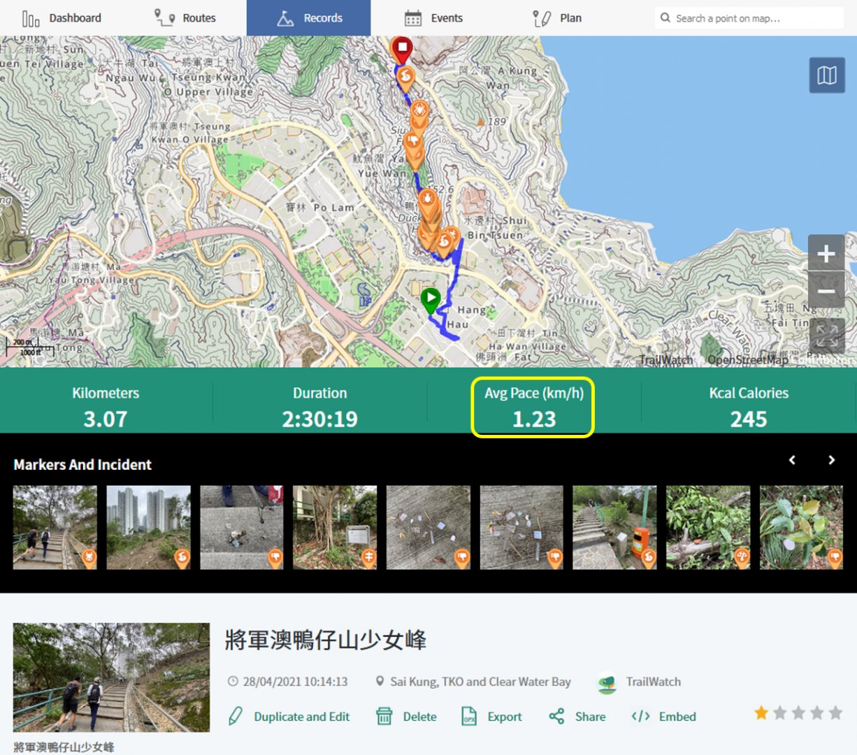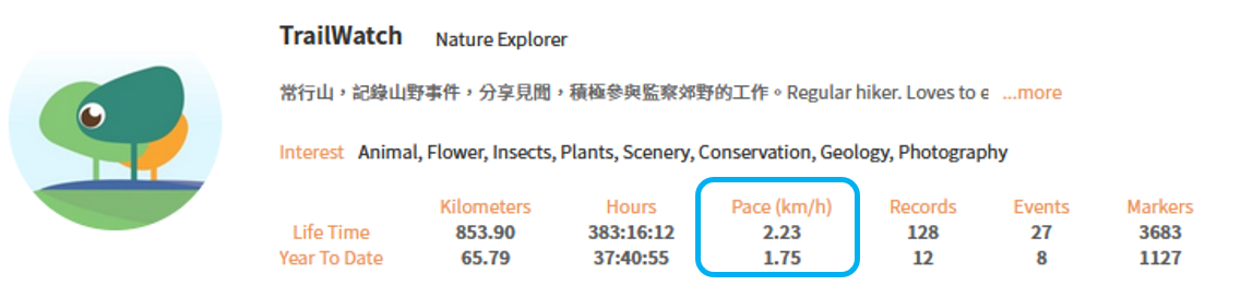 TrailWatch shows your average hiking pace per hiking activity, as well over your total hiking records. The average pace can be used to estimate and gauge how long it may take you to walk a route. It is important to note that different people will have a different pace based on an individual’s physical conditions and hiking preferences.