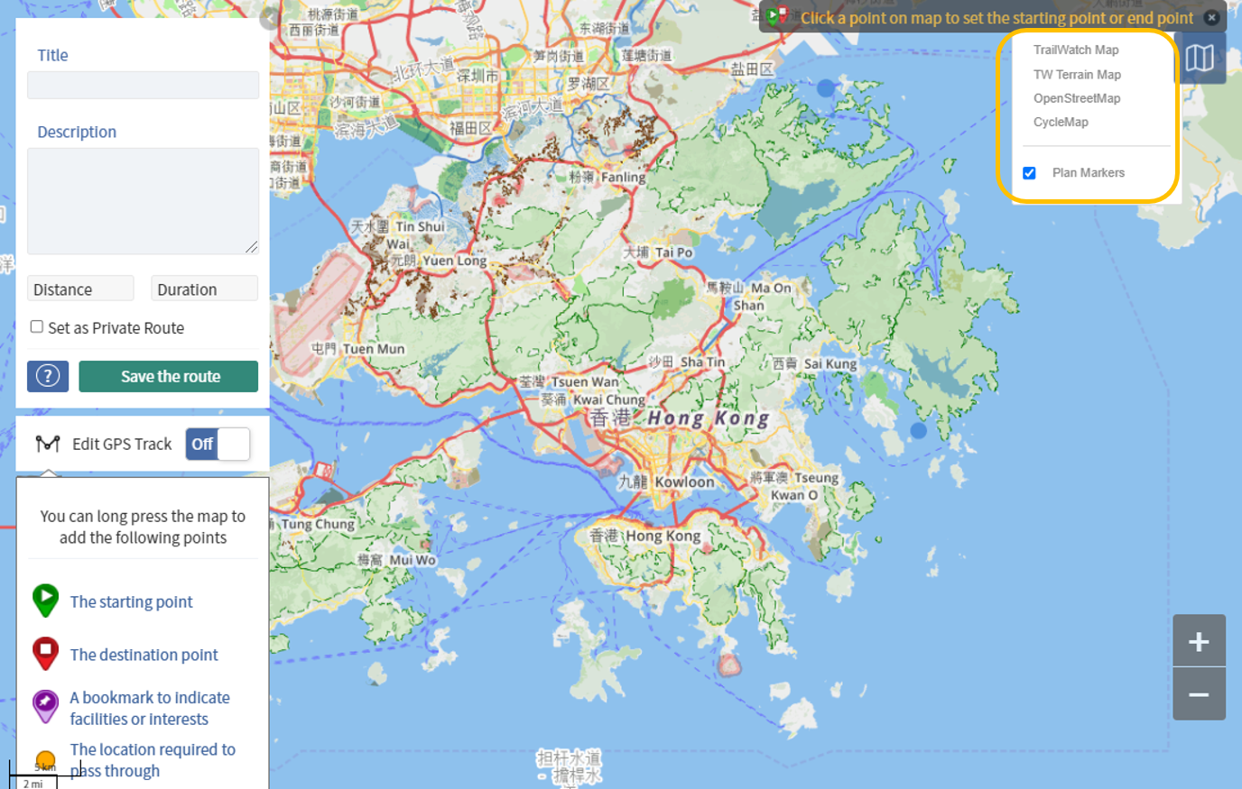The method to calculate distance and elevation is the same regardless of a tracked hiking activity, or for planning the route. We encourage you to use the TrailWatch planning function before you hike. It’s best to do this via the TrailWatch website rather than your phone.