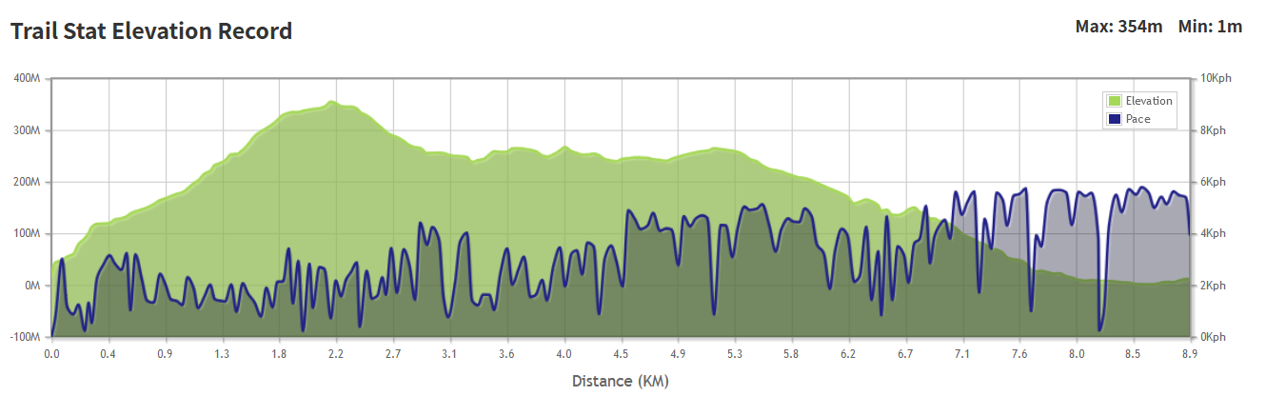 Example of the elevation chart from a planned route from the TrailWatch website. As this route has not yet been walked, there will not be a pace.