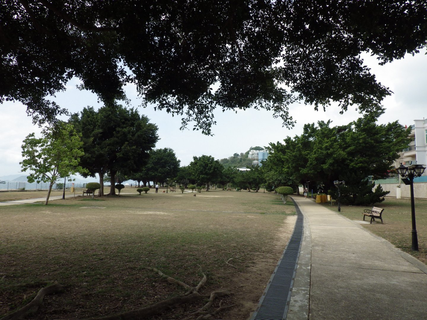 The current coastline of Telegraph Bay (Left). There are residential buildings and a waterfront park (right) managed by Cyberport where many people like to picnic, walk their dogs and play sports.