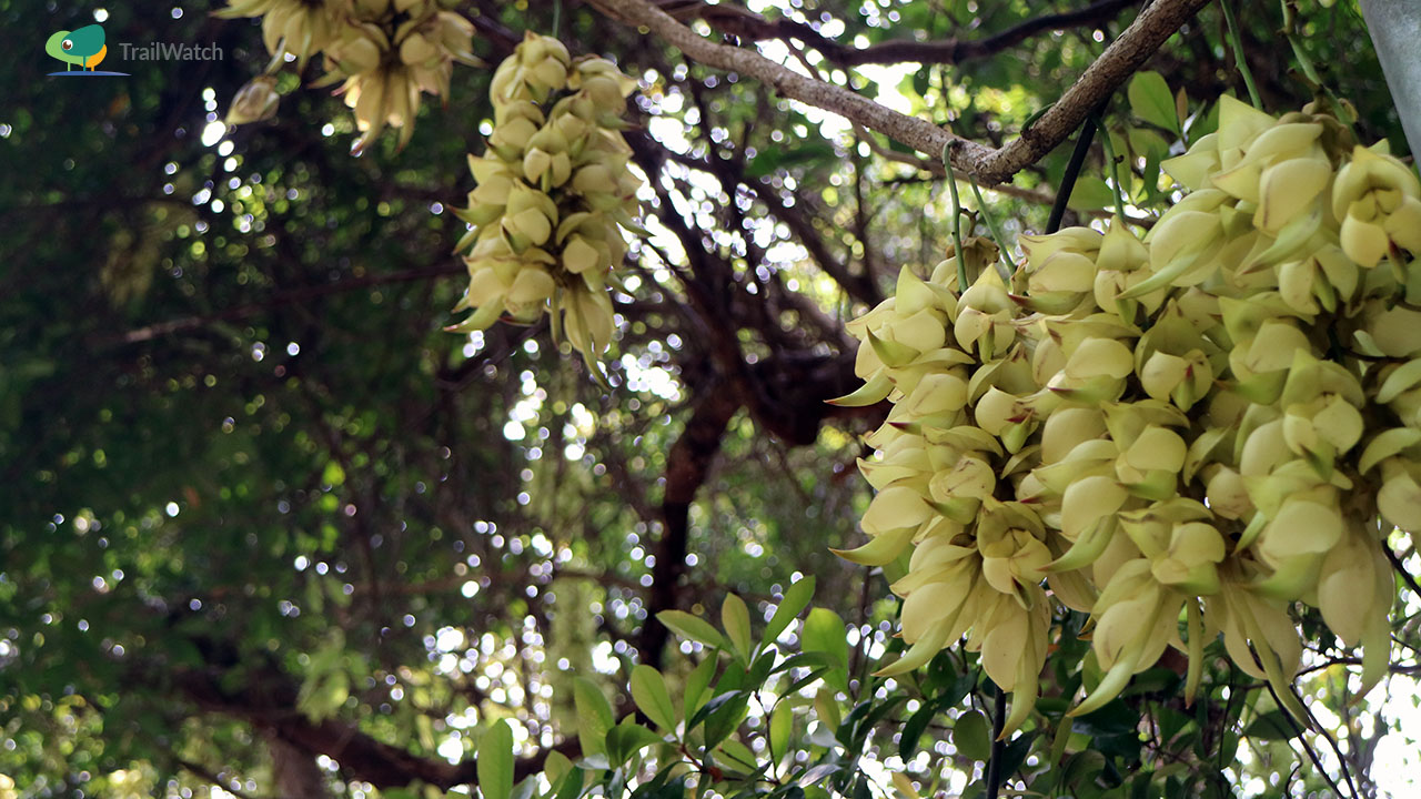 Birdwood’s Mucuna is a native plant and commonly seen in local woods. There is another similar flower named Hong Kong Mucuna/Mucuna championii which is rare in Hong Kong. The flowers of the two species look similar, though those of the Hong Kong Mucuna/Mucuna championii are purple and smaller.