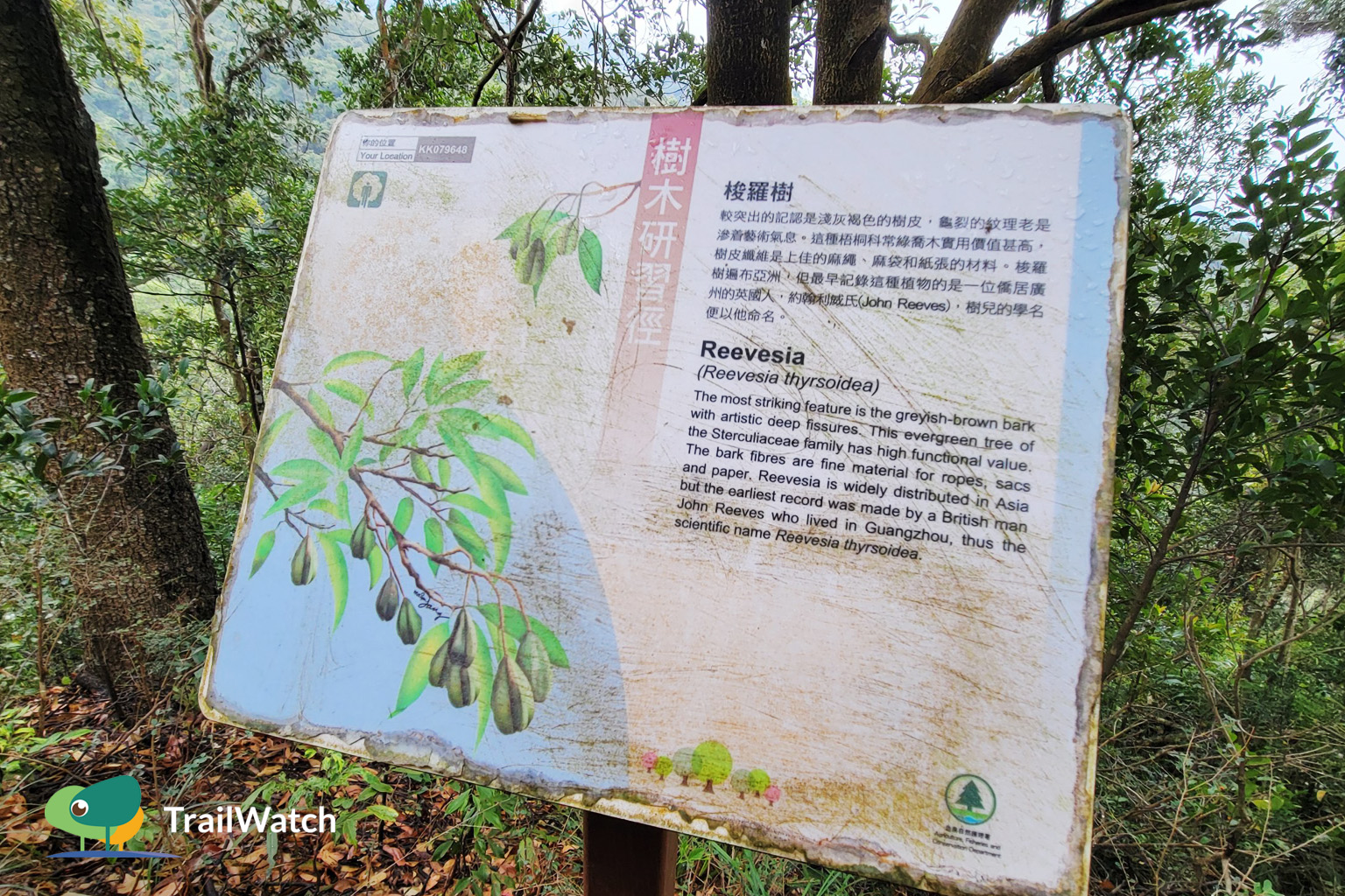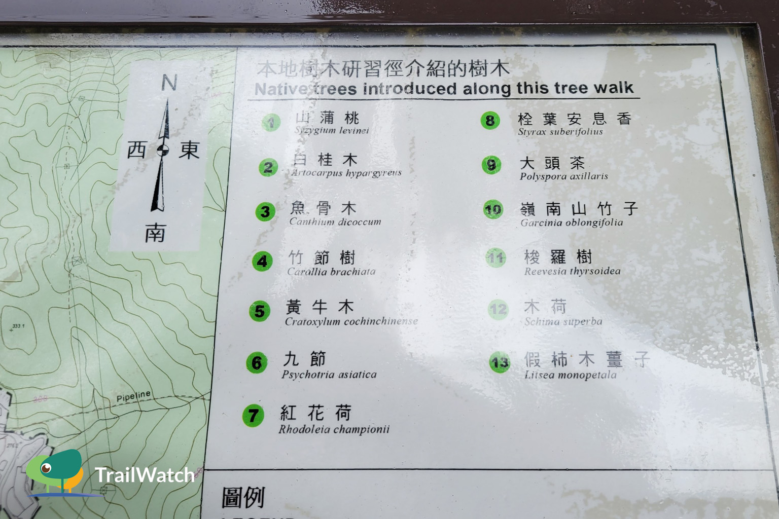 The Aberdeen Tree Walk has information boards at the starting and finishing points, and the map indicates the locations of different tree species with further information available on site. Common trees that can be seen on this route include Yellow Cow Wood, Wild Coffee, and Hong Kong Gordonia. For the latest information about the tree species found on this trail, you can refer to the Enjoy Hiking website.
