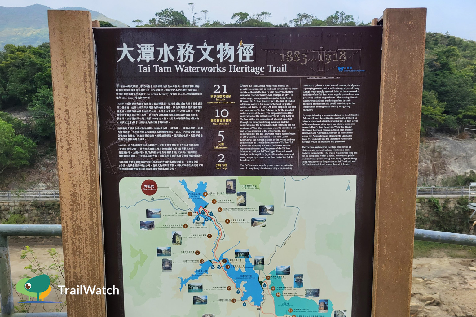 Starting from the Tai Tam Reservoir Road, the first stop introduces the history of the Tai Tam waterworks from 1883 to 1918.